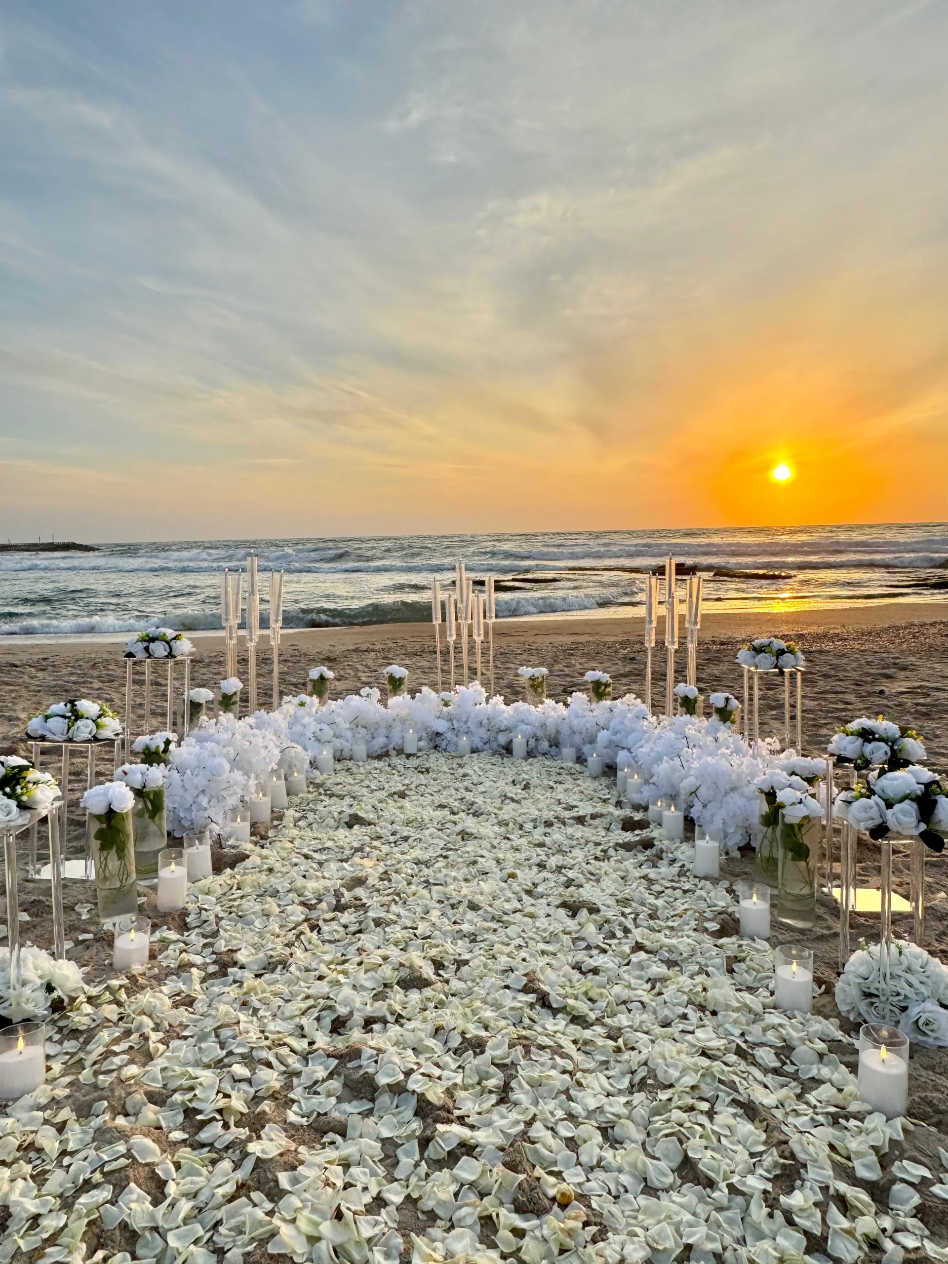 השילוב של שמש שוקעת, רחש הגלים, וחול רך יוצר תפאורה מושלמת להצעת נישואין רומנטית. כמו כן, ניתן לשלב עיצוב רך עם פרחים, שטיחים, נרות וחופה אינטימית. למידע נוסף על הצעות רומנטיות בים >>
